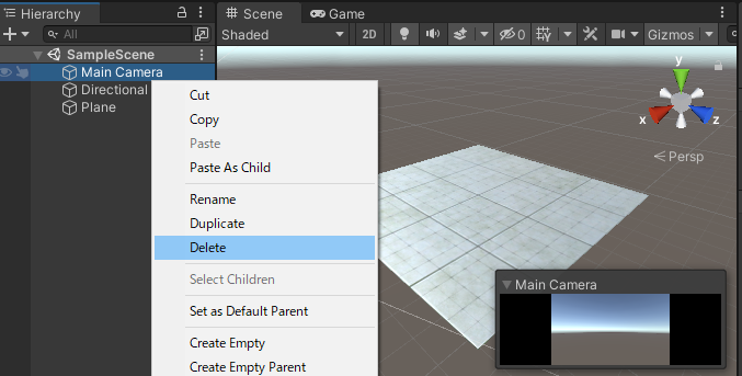 「3Dテンプレート」のシーンに元々ある、MainCameraオブジェクトを削除する。