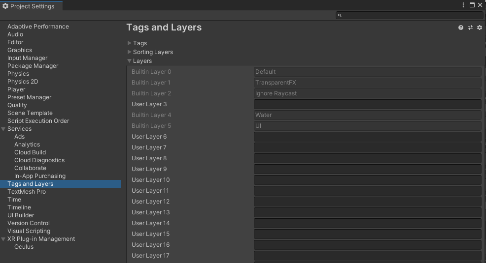 BuildSetting>Tags and Layersに使えるレイヤーのリストがある。