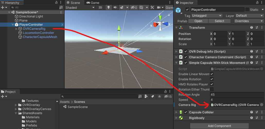 CameraRigに、ヒエラルキーでplayercontrollerの中にあるcamera_rigコンポーネントをドラッグドロップして、参照設定する。