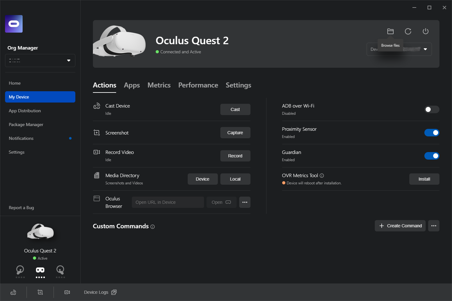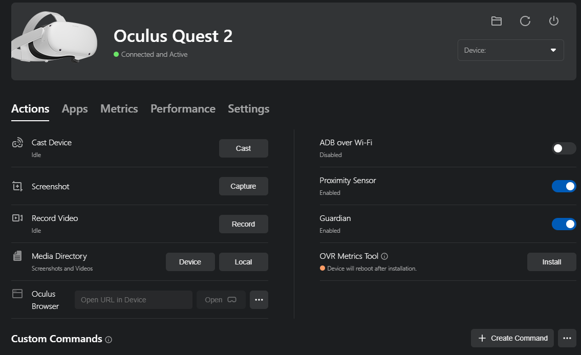 Oculus developers Hubを使えば、ガーディアン無効化など開発者向け設定もできる。