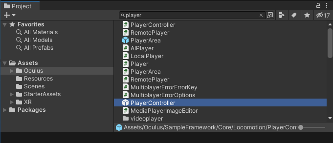 Assetsを”player"で検索して、locomotionのsceneで使われている、PlayerControllerプレファブをヒエラルキーにドラッグドロップする。