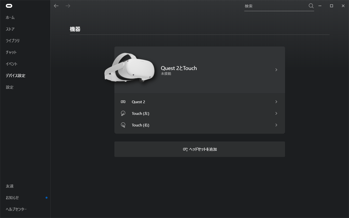 PCでOculusソフトを起動して機器接続を確認する。