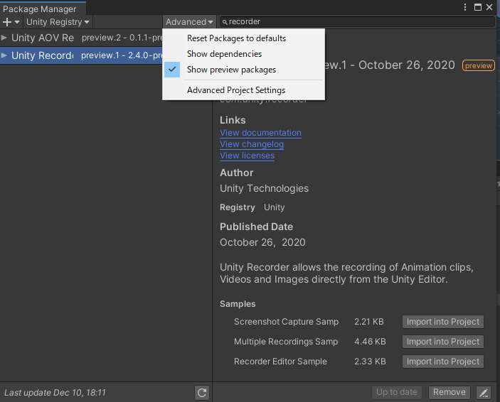 パッケージマネージャーで、プレビューを選択して、RECORDERを検索する。