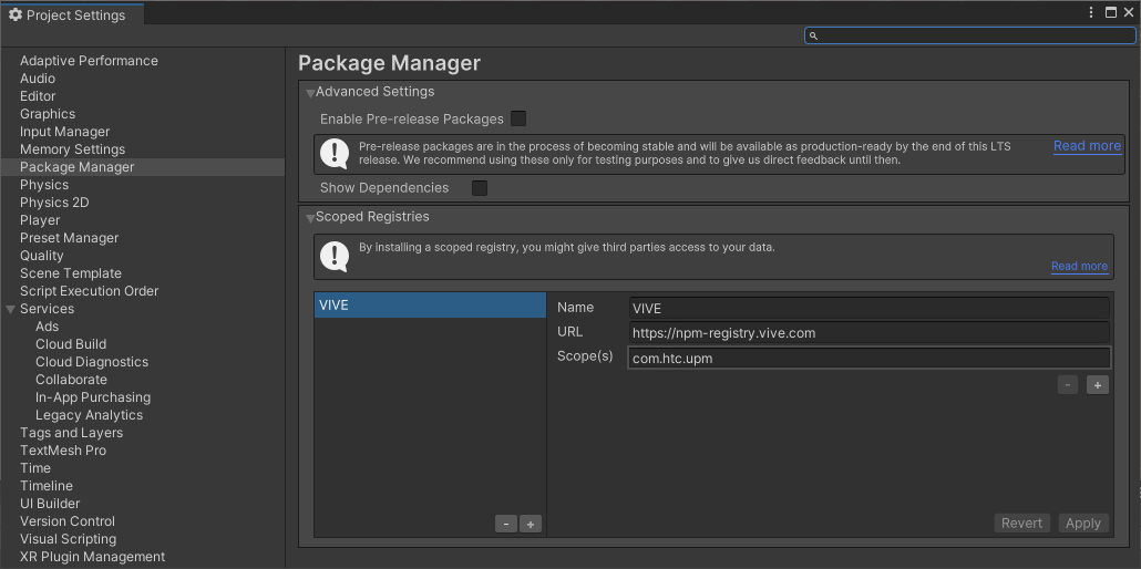 結果、Project Setting>Package Managerでレジストリ追加が確認できる。