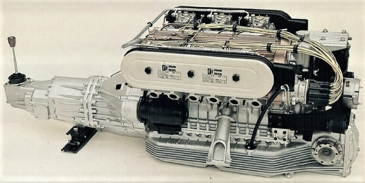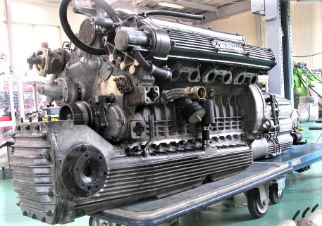 V16Tは、ダンテジアコーサ式に横置きされるUraccoのV8エンジンを左右に直列に2台積むという着想で、中央から直角にアウトプットシャフトが出ています。