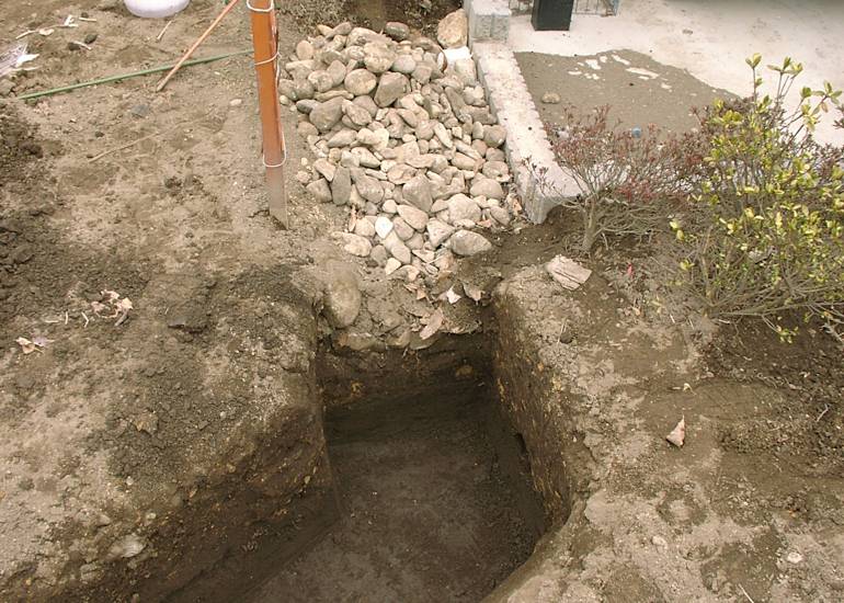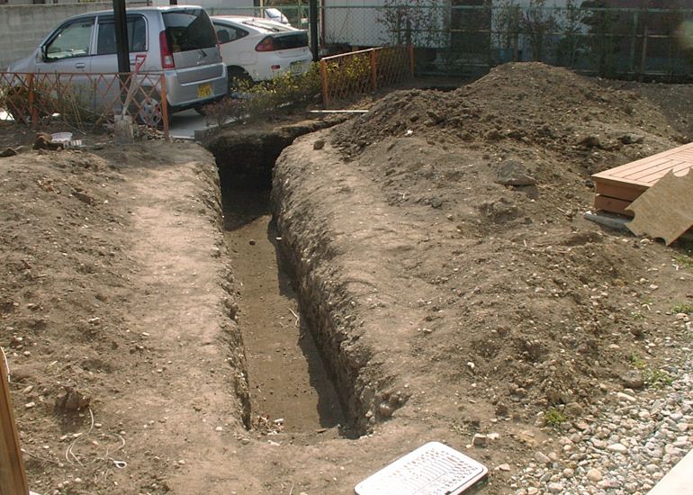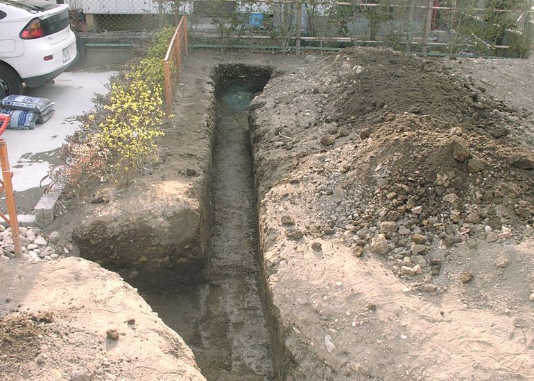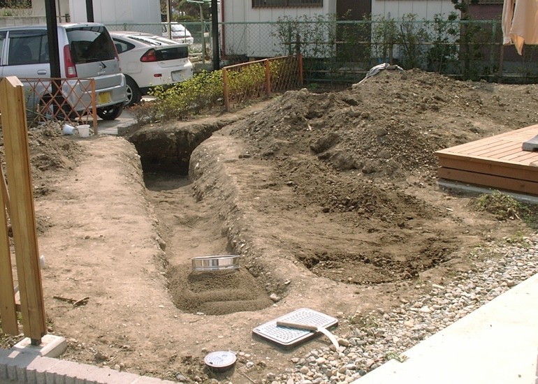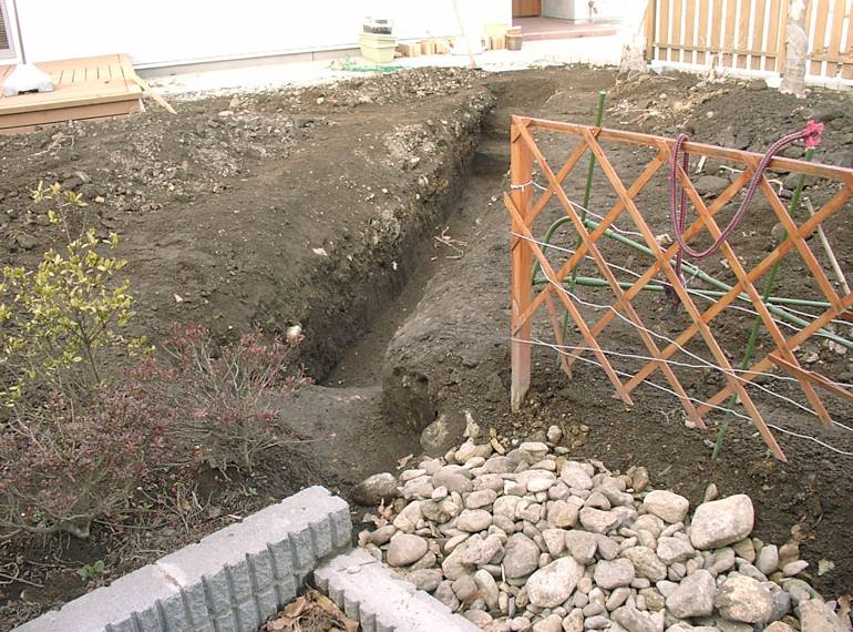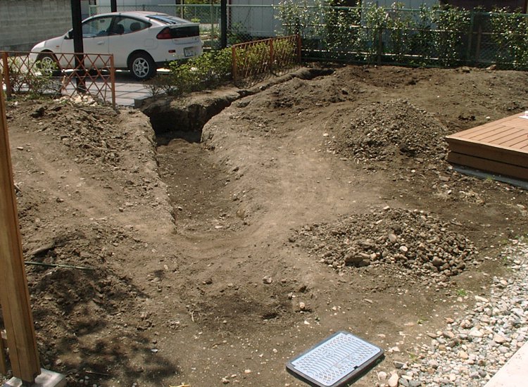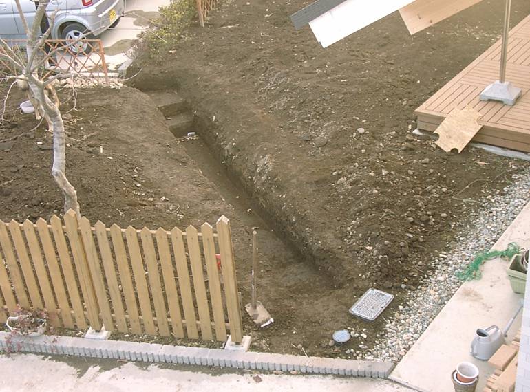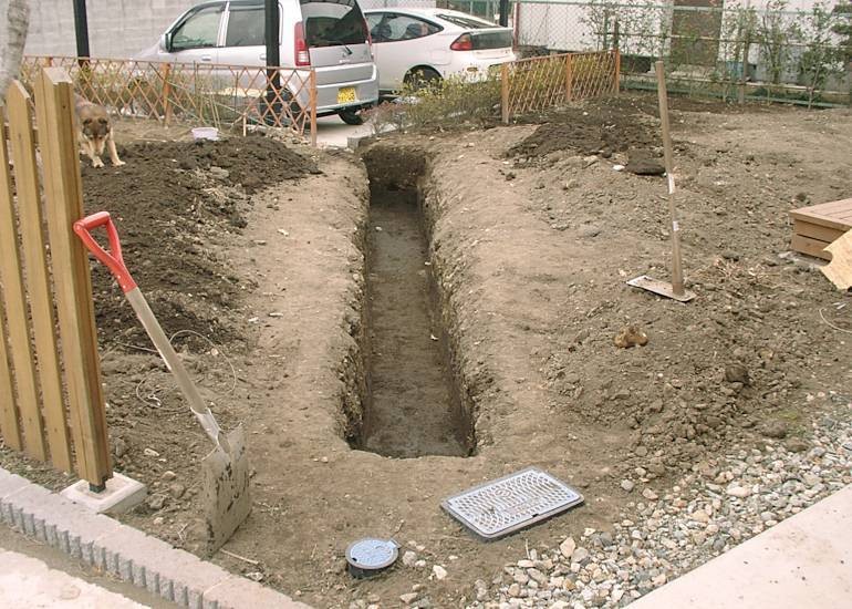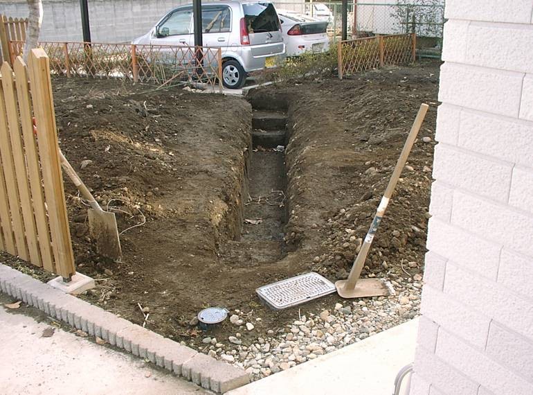 カーポートの裏が冬の間は日当たりが悪くて湿りがちなので、この場所にも水路となるように堀を延長した。